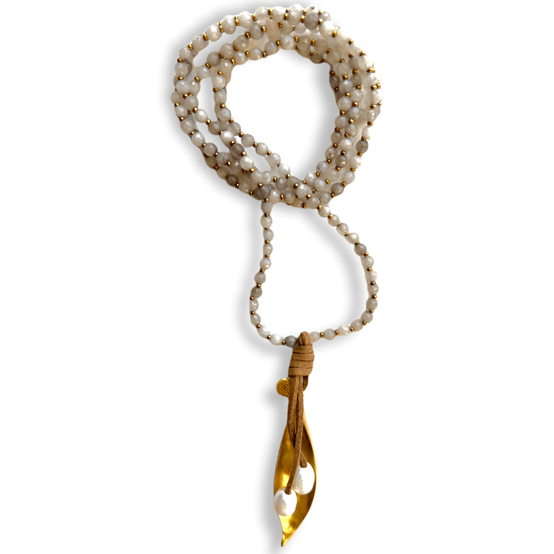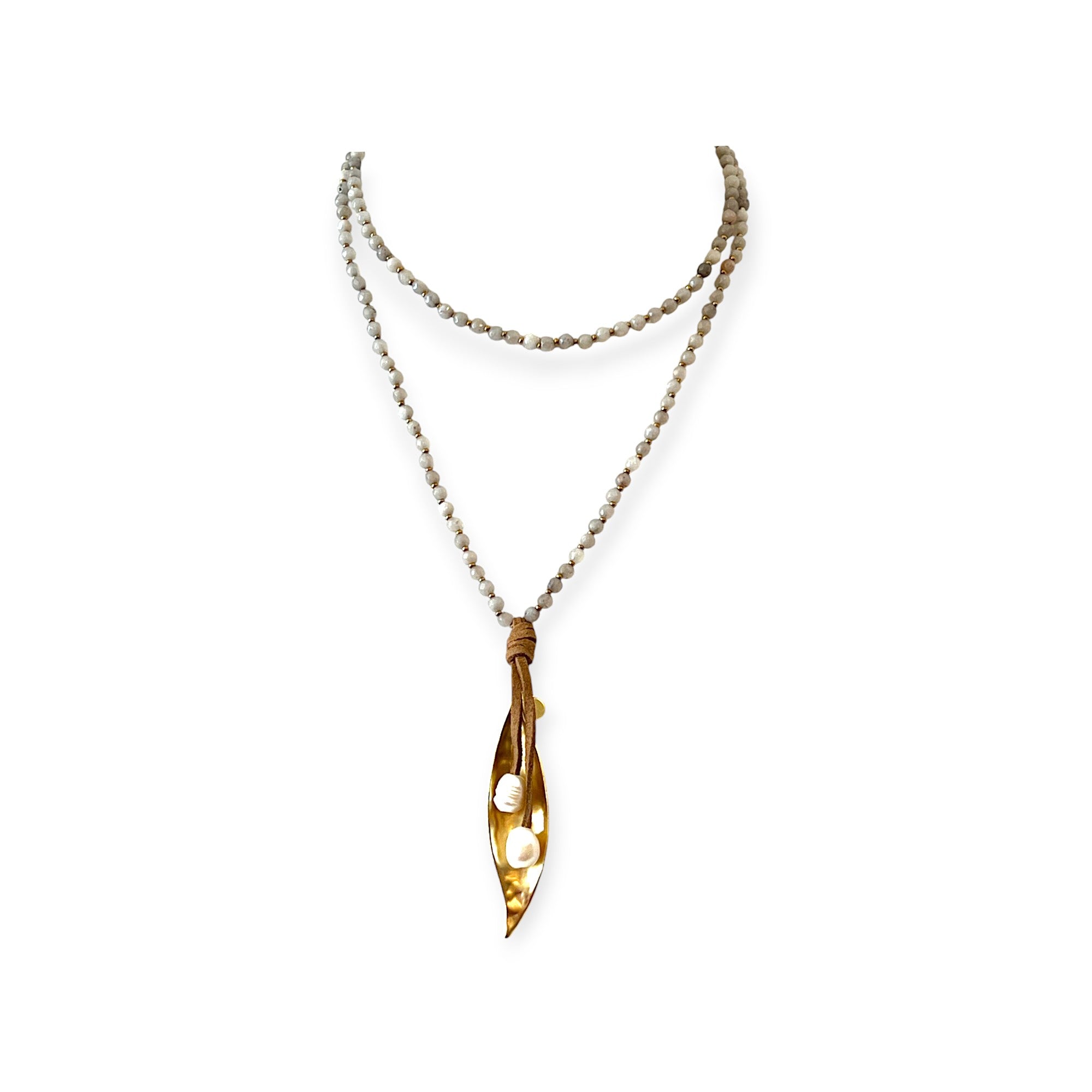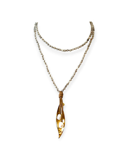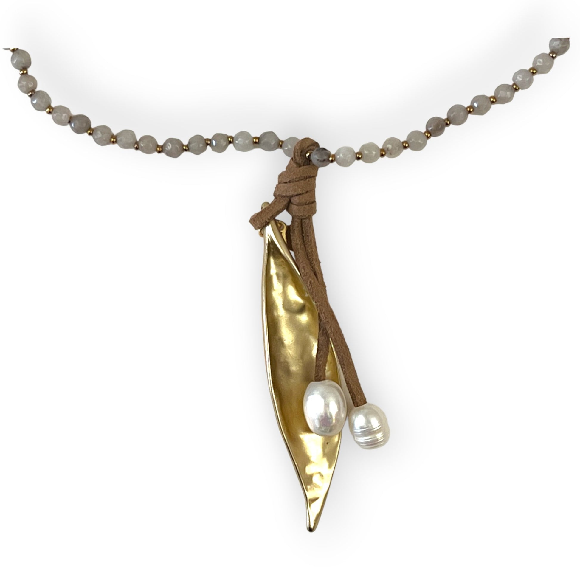This unique organic inspired pearl necklace combines organic design with clever versatility. A string of lustrous quartz and pearls sweeps the neckline, anchoring on a beautifully curved brass accent that mimics the gentle shape of a pea pod. With a soft leather backing, it’s comfortable to wear and adjusts effortlessly to flatter multiple necklines.