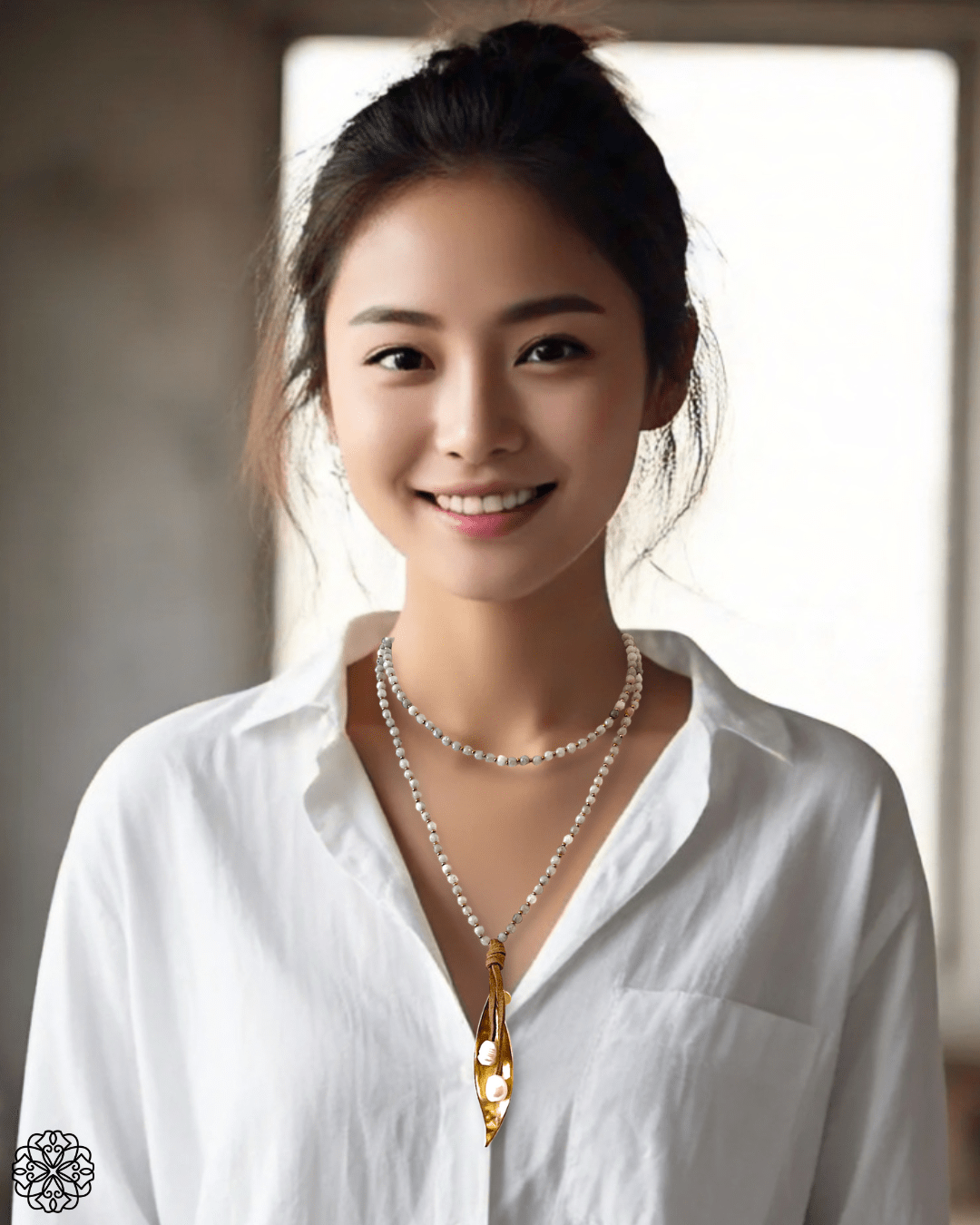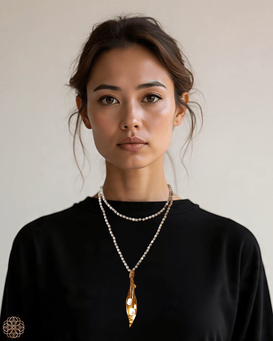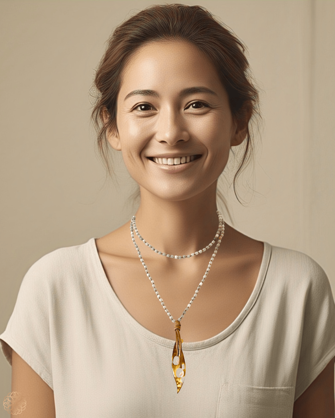 This unique organic inspired pearl necklace combines organic design with clever versatility. A string of lustrous quartz and pearls sweeps the neckline, anchoring on a beautifully curved brass accent that mimics the gentle shape of a pea pod. With a soft leather backing, it’s comfortable to wear and adjusts effortlessly to flatter multiple necklines.