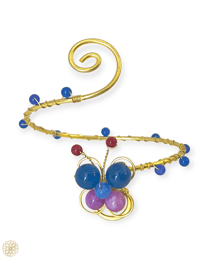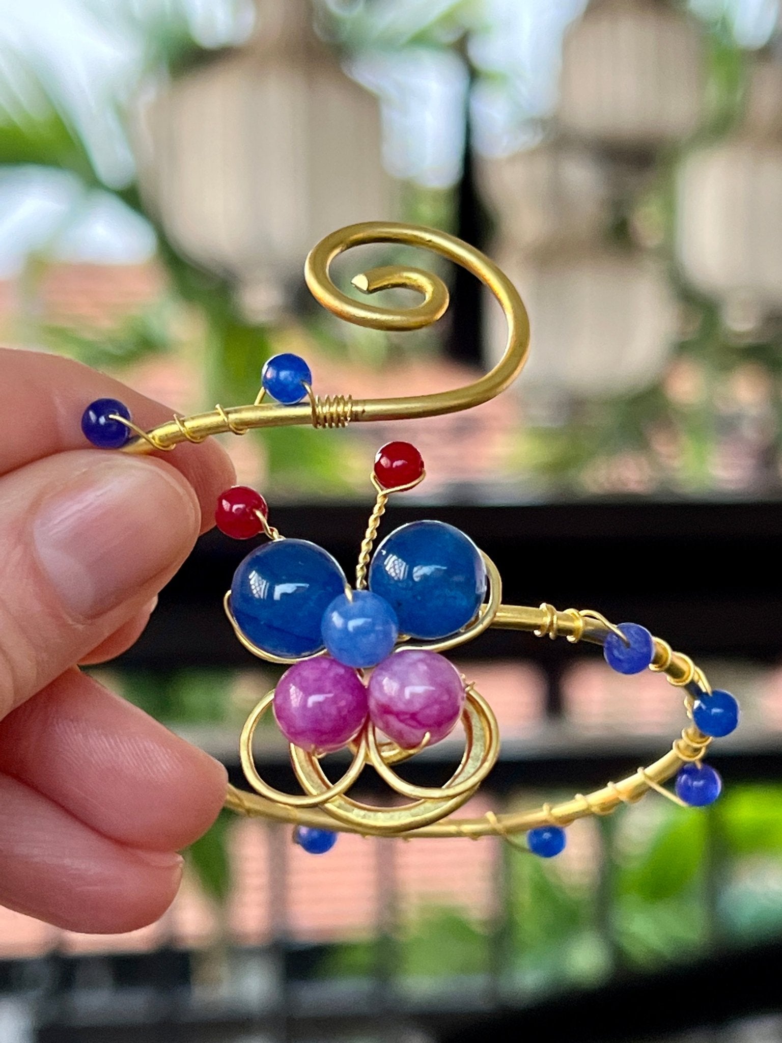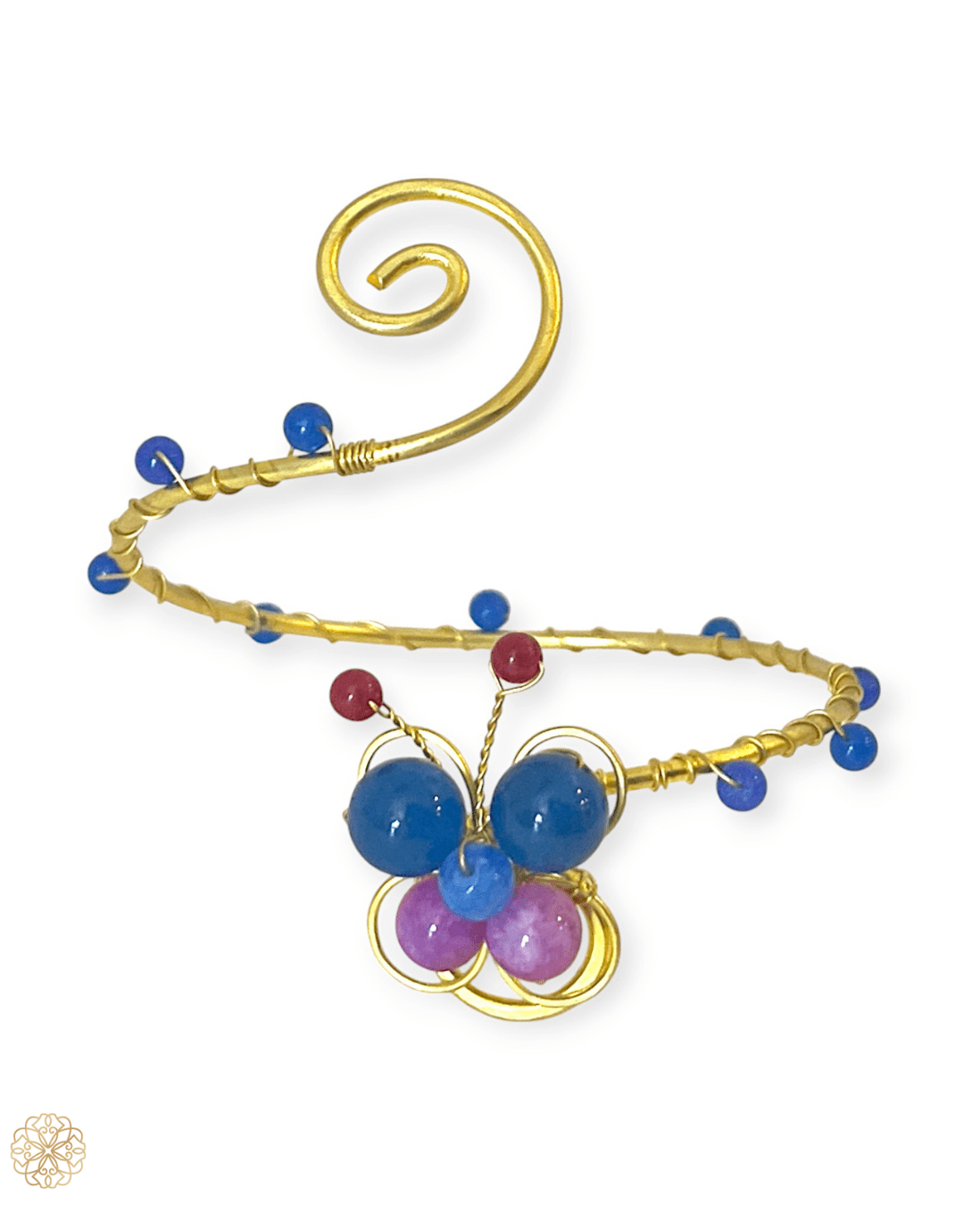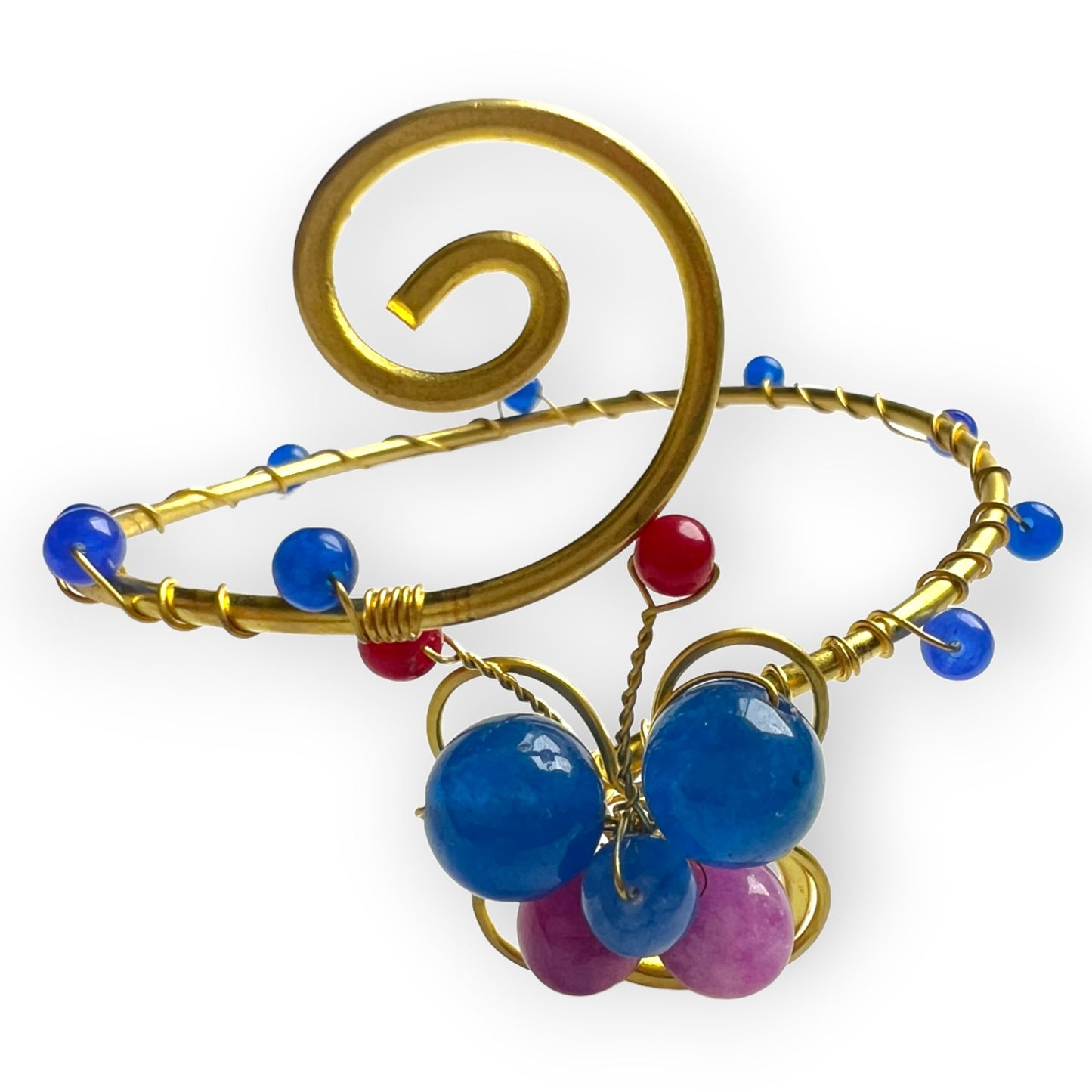 Fun, whimsical, and full of personality, this handcrafted serpentine-style cuff bracelet brings a joyful burst of color and charm to any look. The brass bracelet is expertly woven into a flowing serpentine shape, culminating in a delightful butterfly motif created from vibrant gemstones.