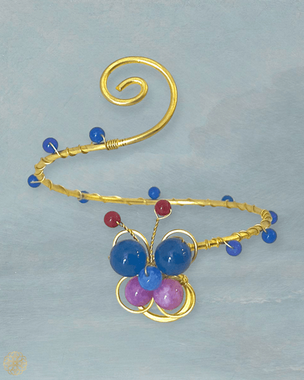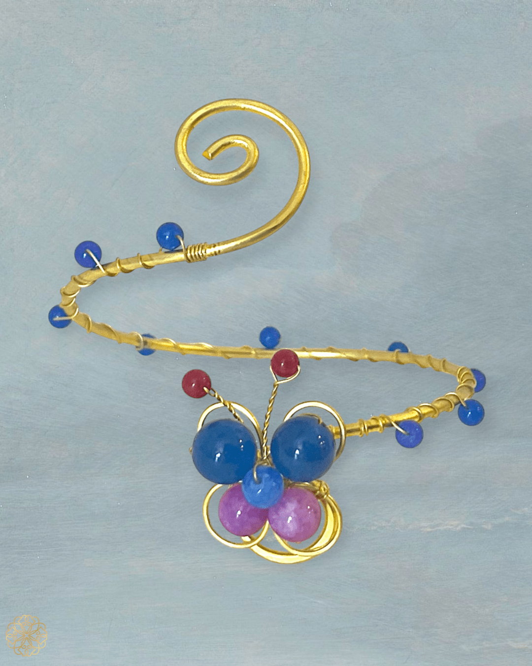 – Handwoven brass serpentine-style cuff with a gemstone butterfly accent