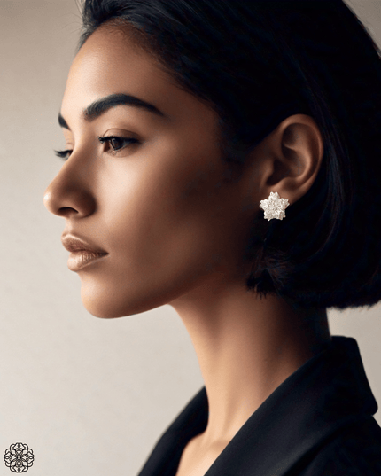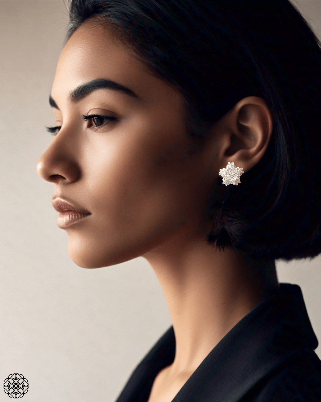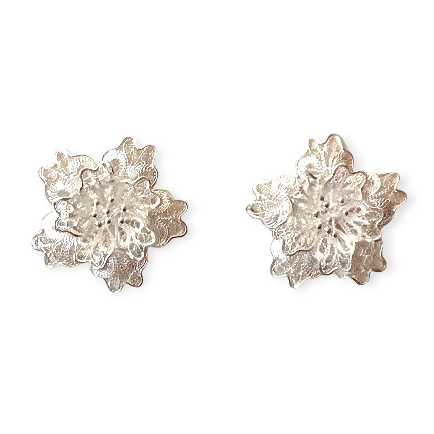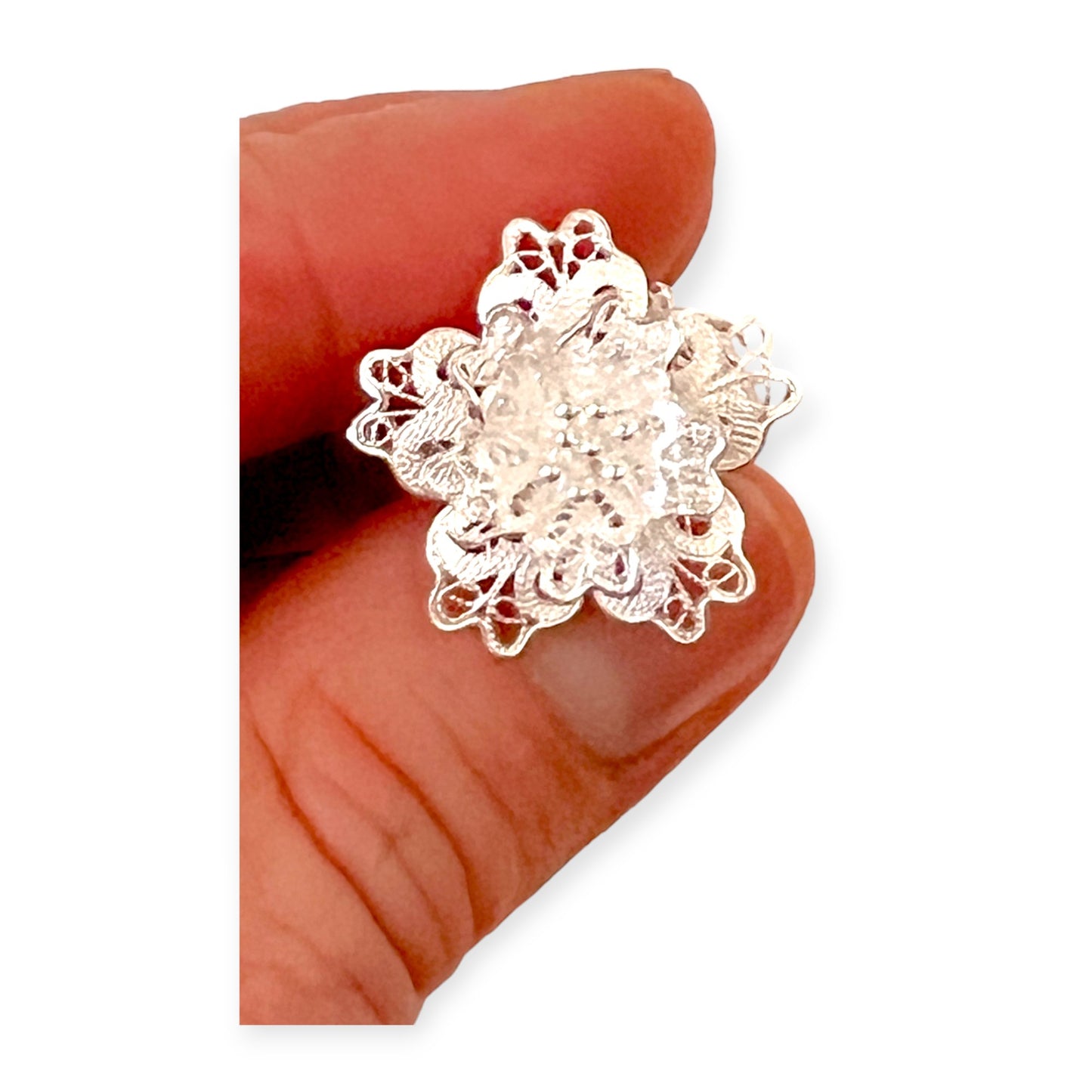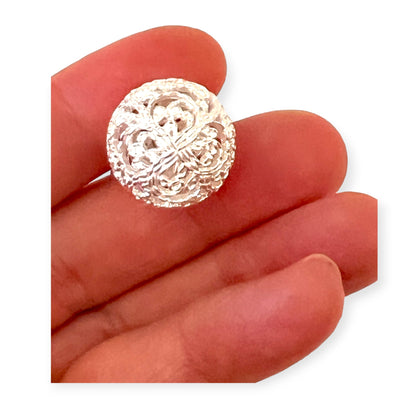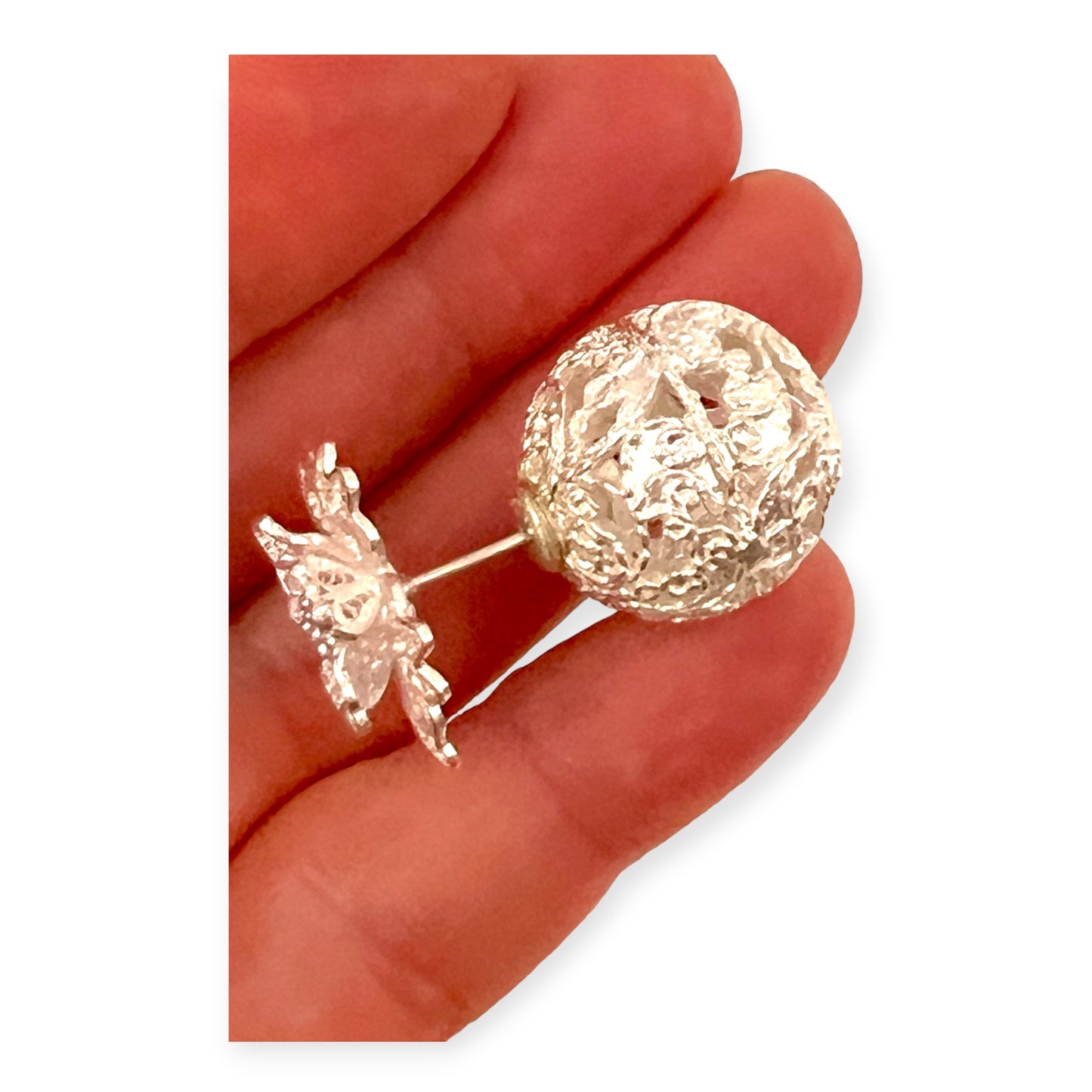 Handcrafted by a talented jewelry designer that works in silver, these stunning silver filigree ball and flower stud earrings will capture the attention and imagination. The back is a filigree sphere and the front is a five petal flower also of filigree.