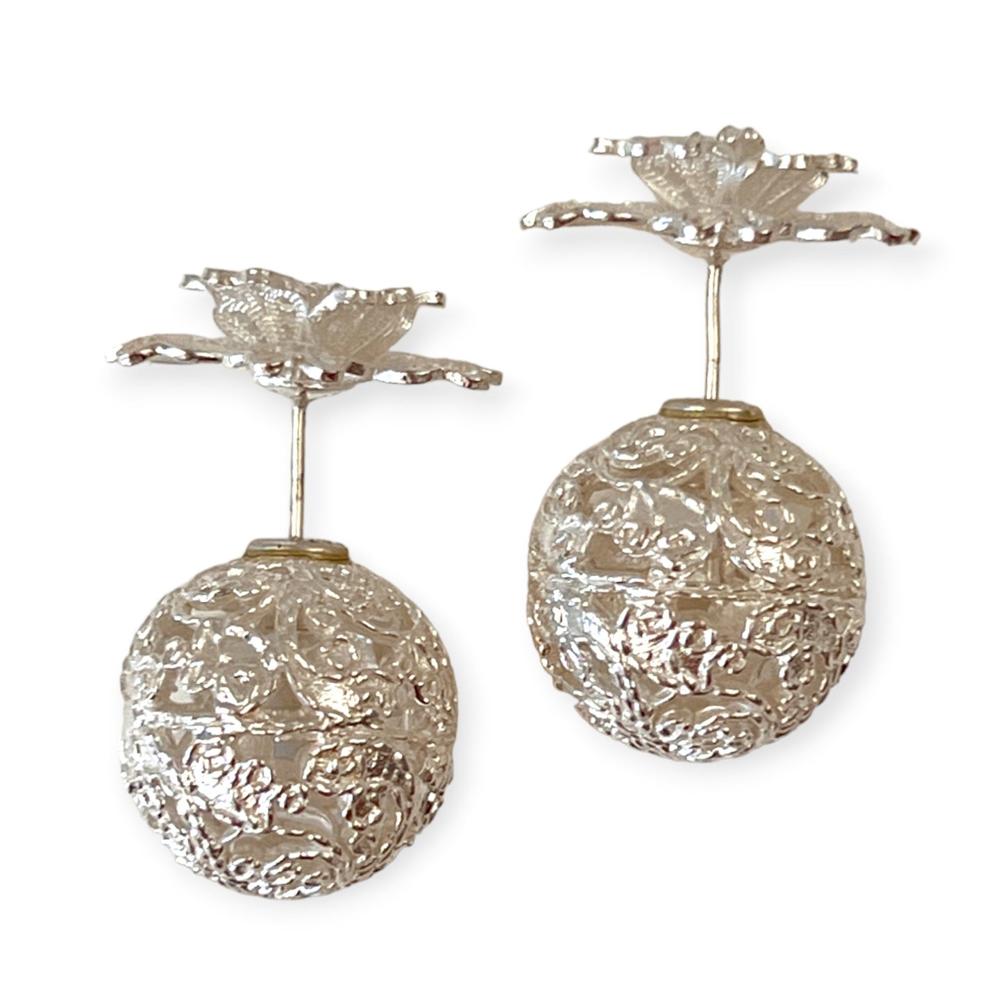 Details: Silver filigree ball and flower stud earrings in the back and a filigree flower at the front. Made of sterling silver. For those concerned about weight, these silver drop earrings are light