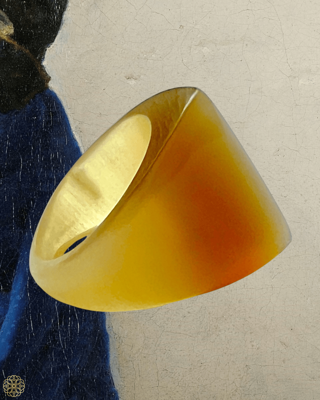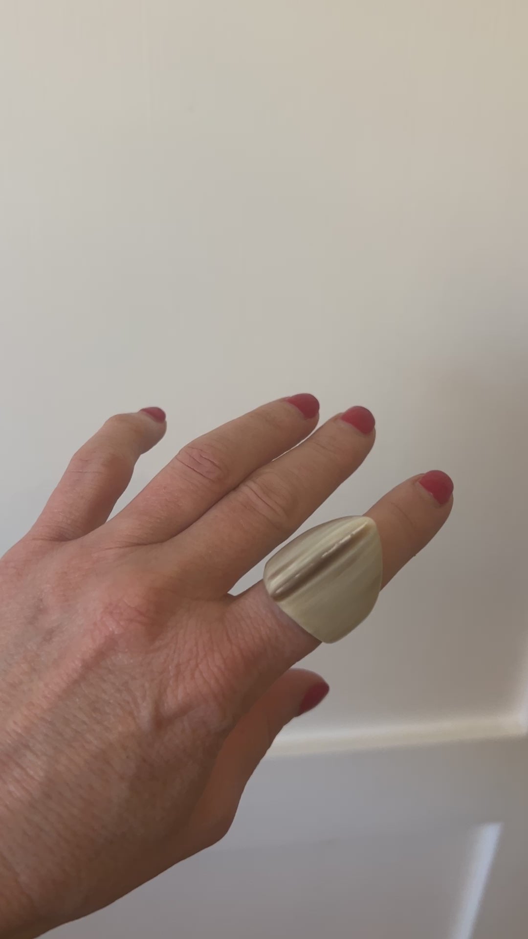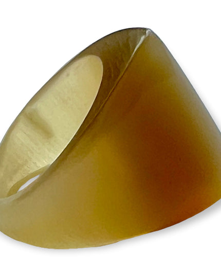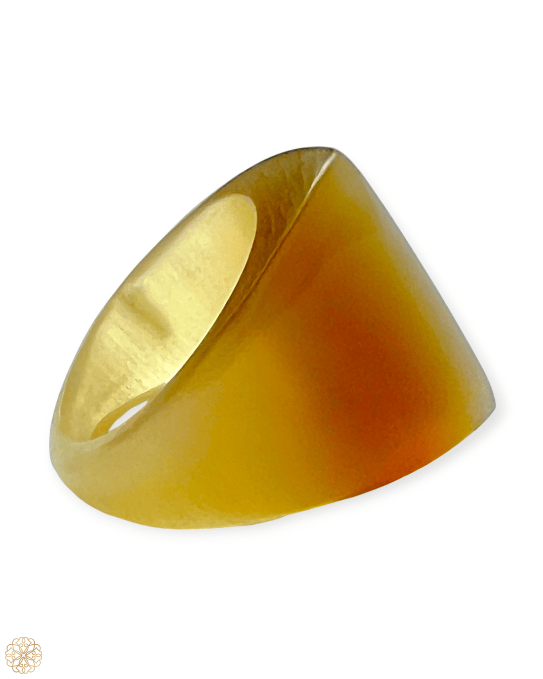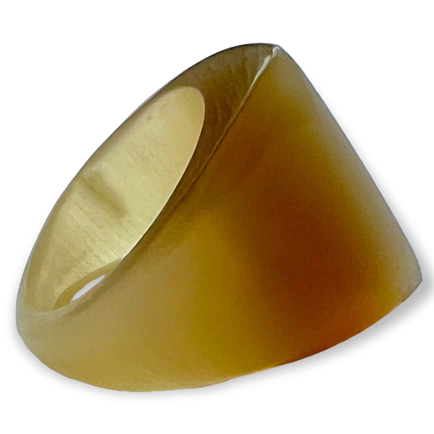 This sleek, minimalist statement ring is crafted from a single, solid piece of horn, showcasing the natural beauty and unique patterns of the material. The ring features a modern, clean design that narrows at the back and widens towards the front, where a subtle "seam" runs from top to bottom, giving it an edge that makes it stand out. Perfect for those seeking a distinctive yet refined accessory, this ring offers a beautiful mix of simplicity and boldness.