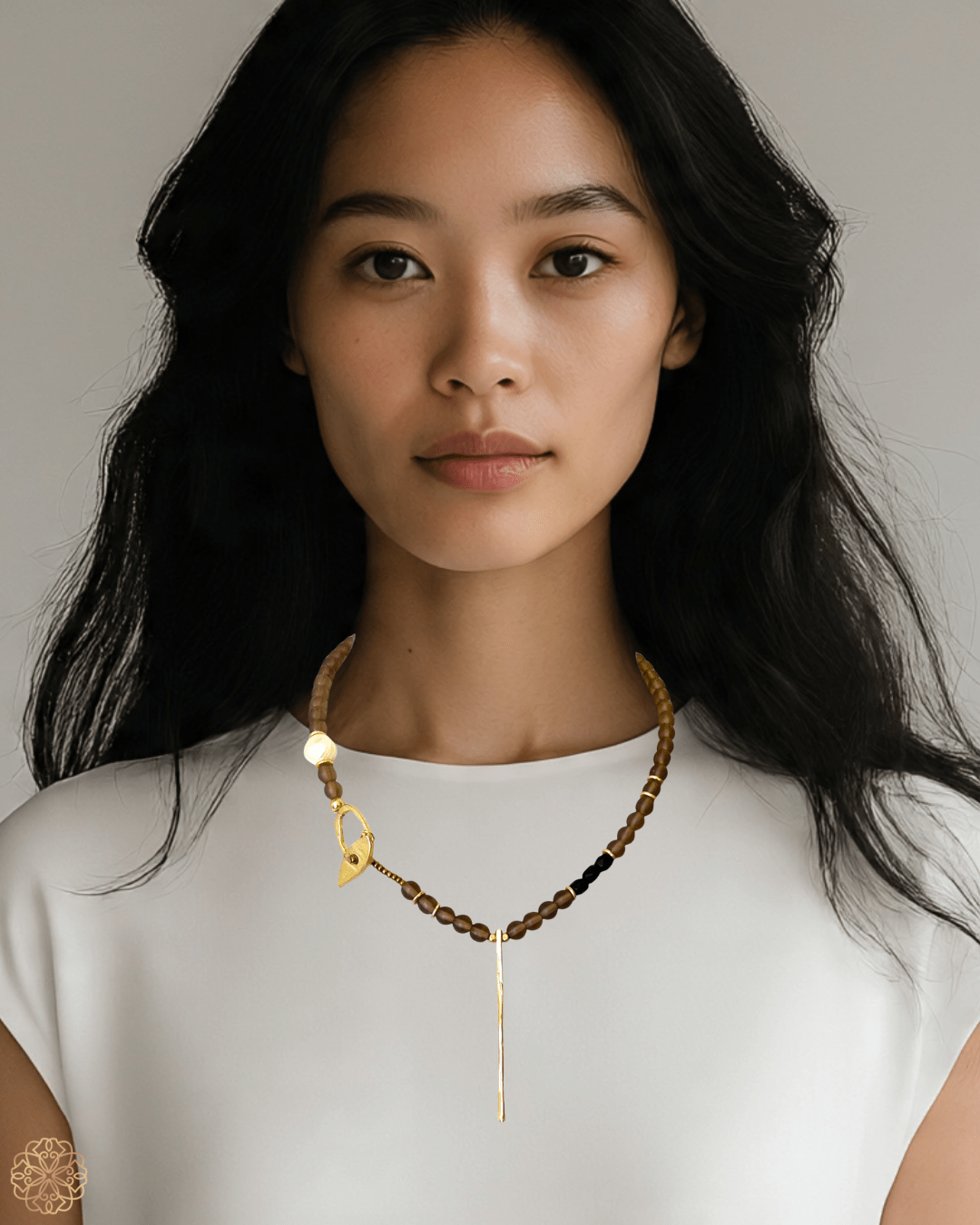 Designed to transition effortlessly from casual cool to polished elegance, this uniquely crafted smokey quartz necklace is a masterclass in contrast and harmony. Featuring a thoughtful interplay of smokey quartz beads, black chalcedony, a single lustrous pearl, and brass accents, this piece offers a refined yet artistic edge.
