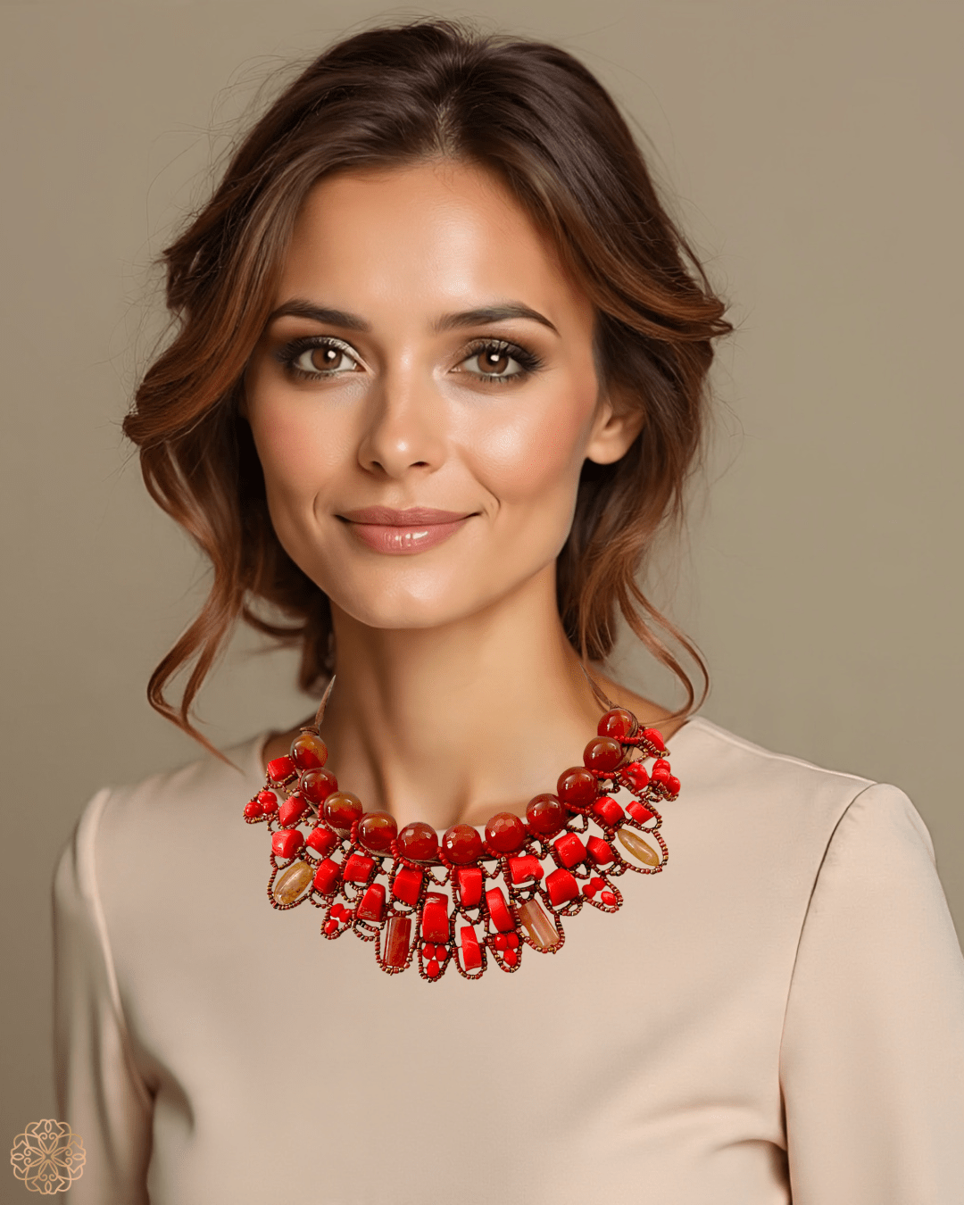 Bring the warmth and intensity of a desert sunset to your jewelry collection with this dramatic, one-of-a-kind collar necklace. Handcrafted from a vibrant mix of red jasper, carnelian agate, coral, howlite, and delicate seed beads, this bib-style statement piece is a wearable mosaic of rich textures and fiery tones.