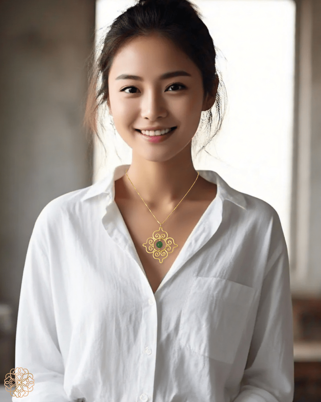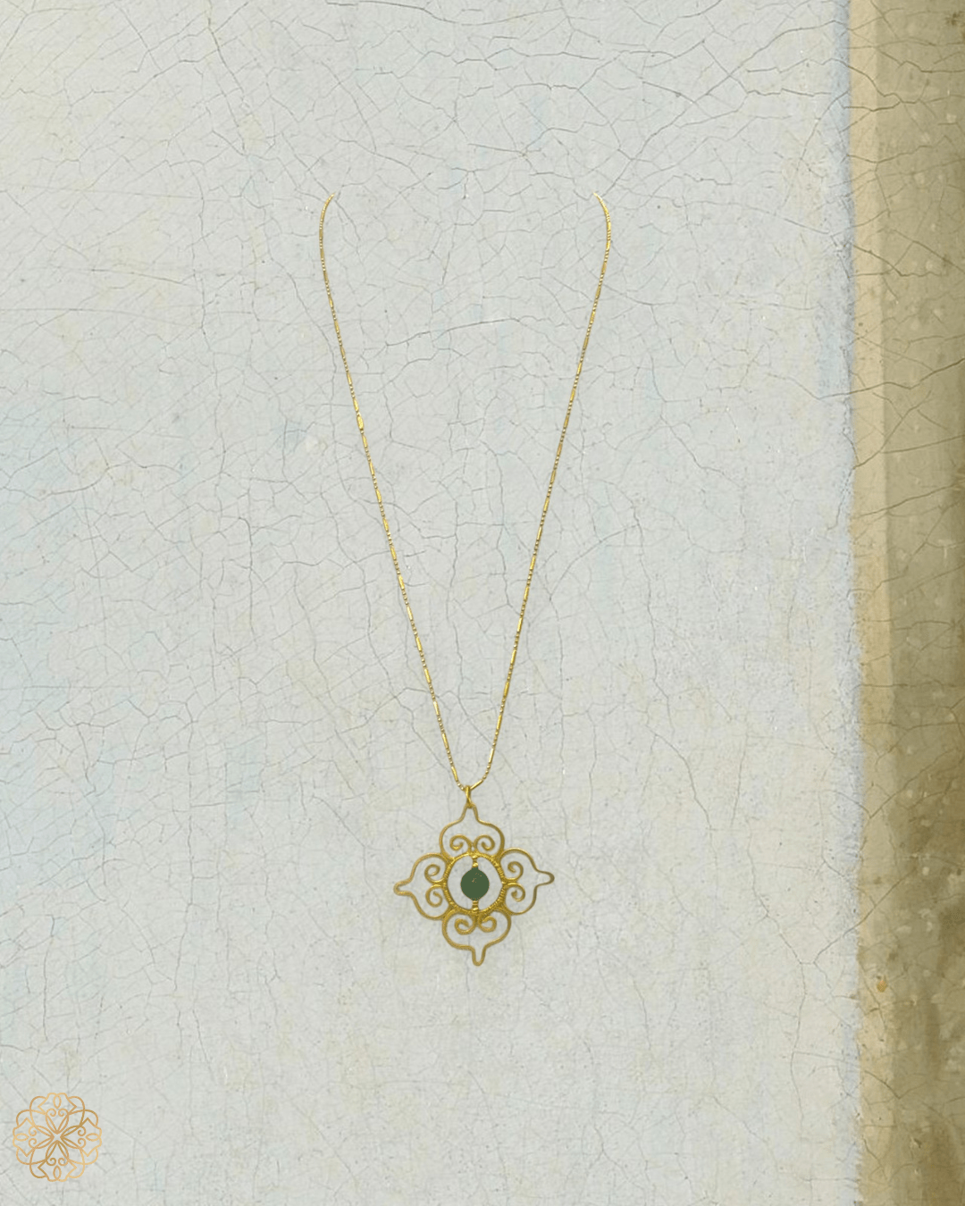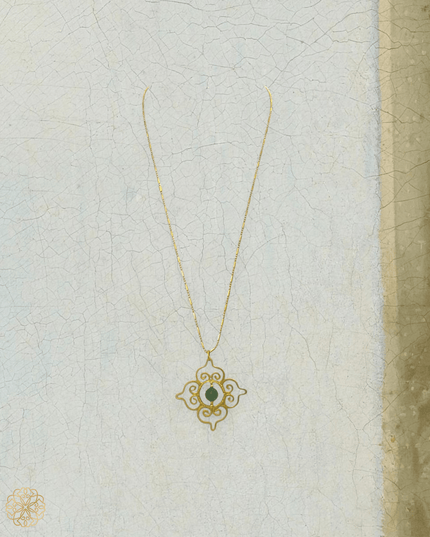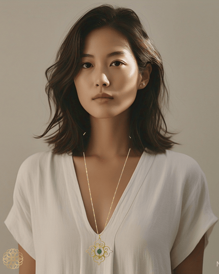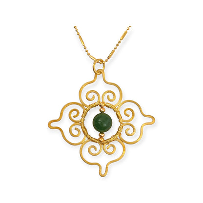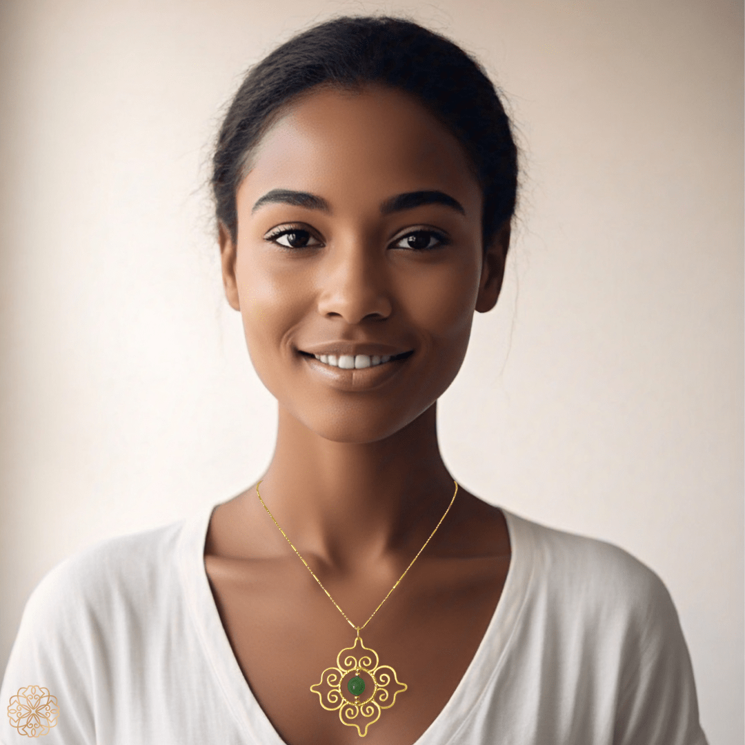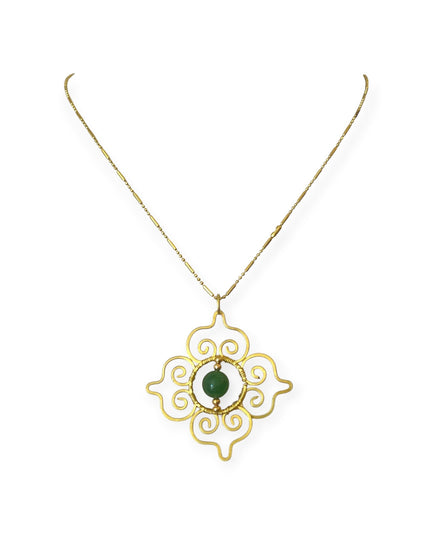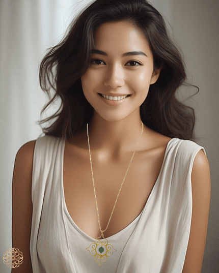 This Thai-inspired pendant necklace blends traditional motifs with modern wearability. Featuring a vivid green chalcedony gemstone at its center, the pendant showcases a classic pattern drawn from Thai design heritage—creating a statement piece that's both meaningful and stylish.