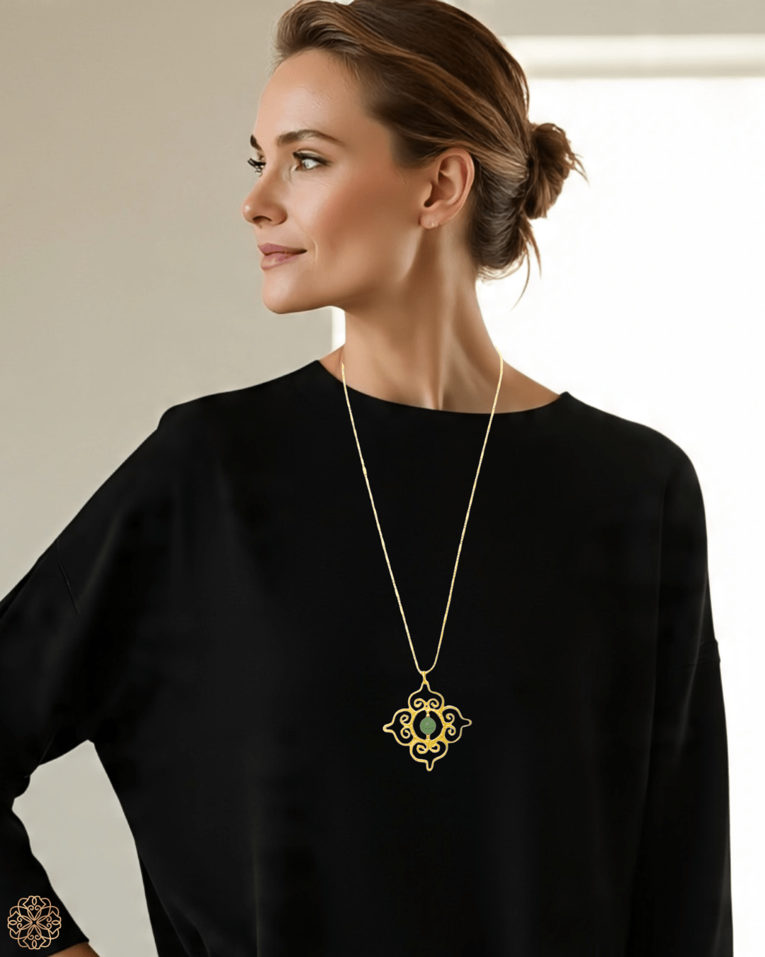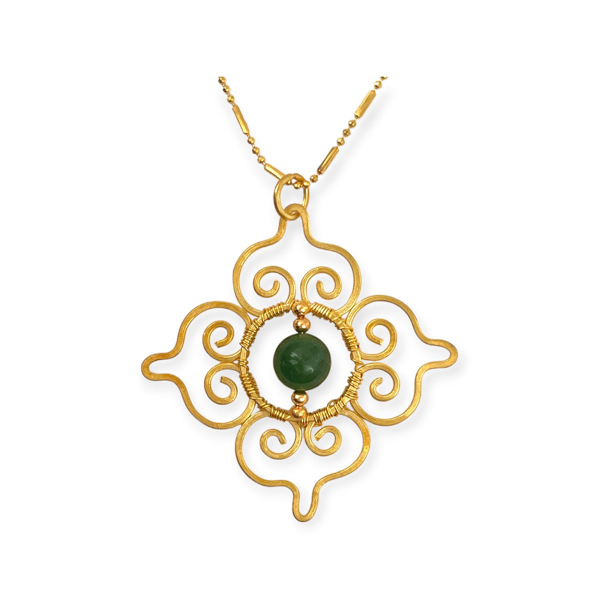 • Design: Thai design inspired pendant with green chalcedony centerpiece