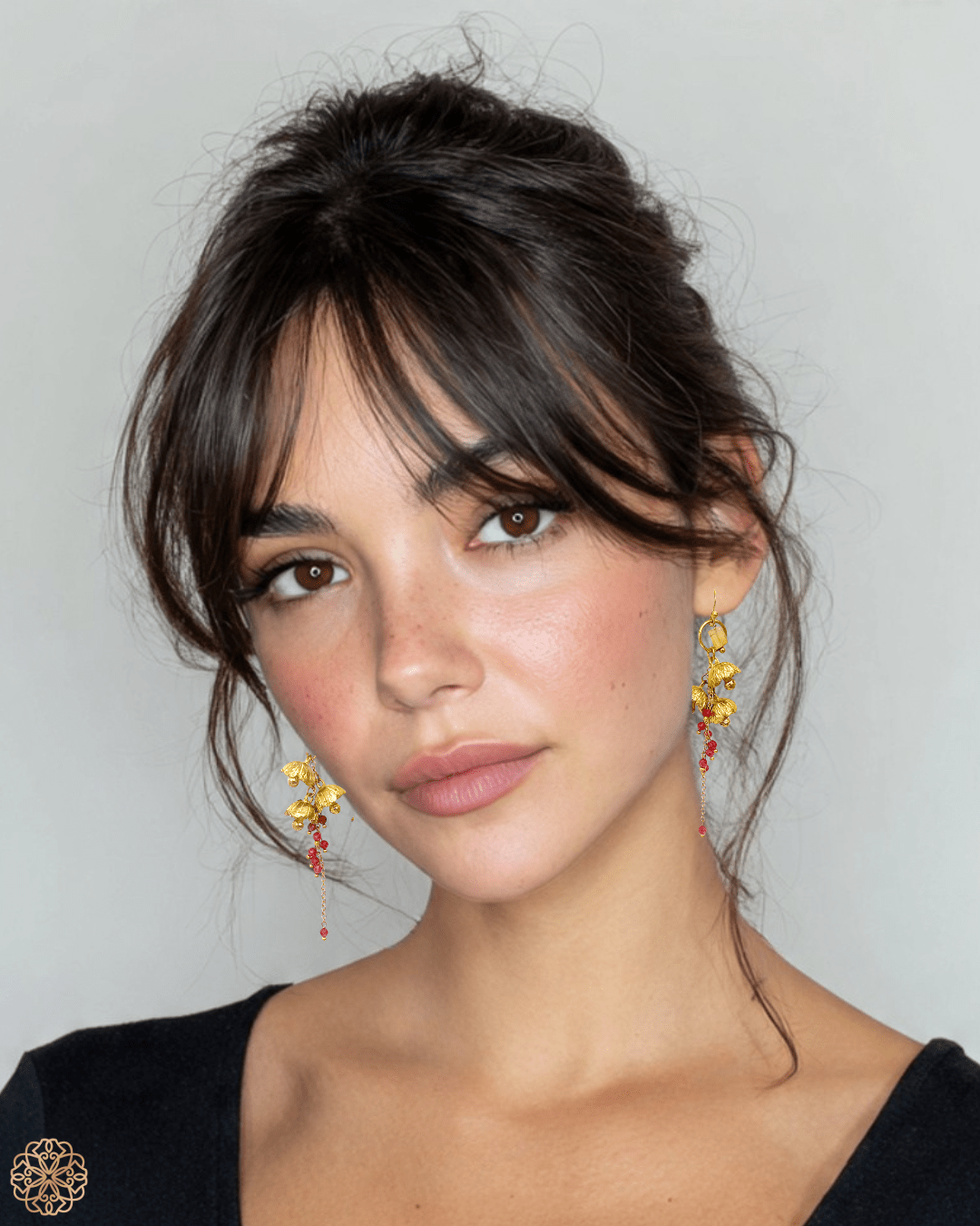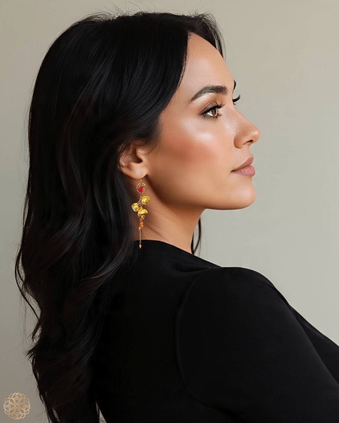 Add a flourish of charm to your look with our Trio of Fleurs Earrings — a whimsical ode to springtime blossoms and the joyful rhythm of nature. Each handcrafted earring features three petite flower buds that sway gracefully from a central ring, complemented by a larger gemstone drop and a delicate chain tendril adorned with tiny, shimmering stones. The layered design creates movement, texture, and an effortlessly elegant silhouette.