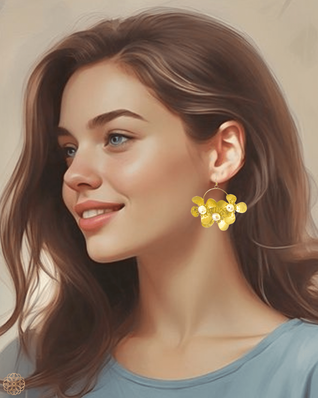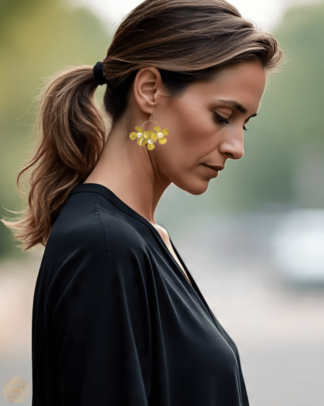 Designed to dazzle and destined for special moments, these striking floral statement earrings are a rare find. Suspended from a sleek hoop, each earring features a cluster of three handcrafted brass flowers, delicately gathered at the base; each bloom adorned with a lustrous pearl center for a soft, glowing finish.