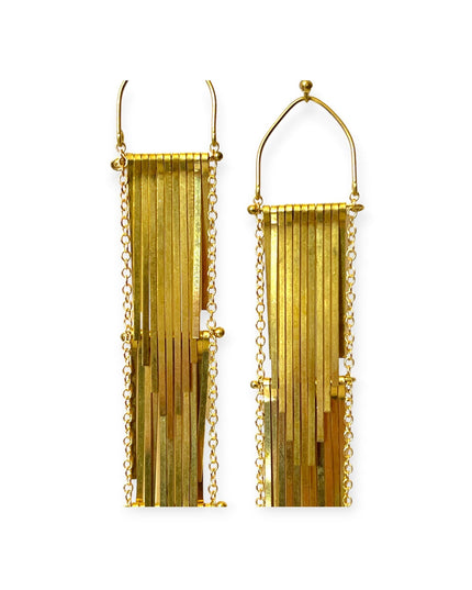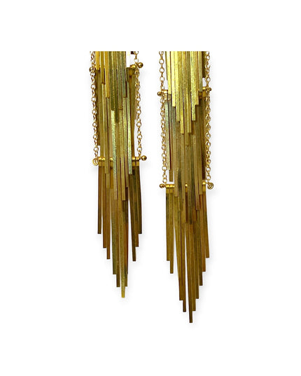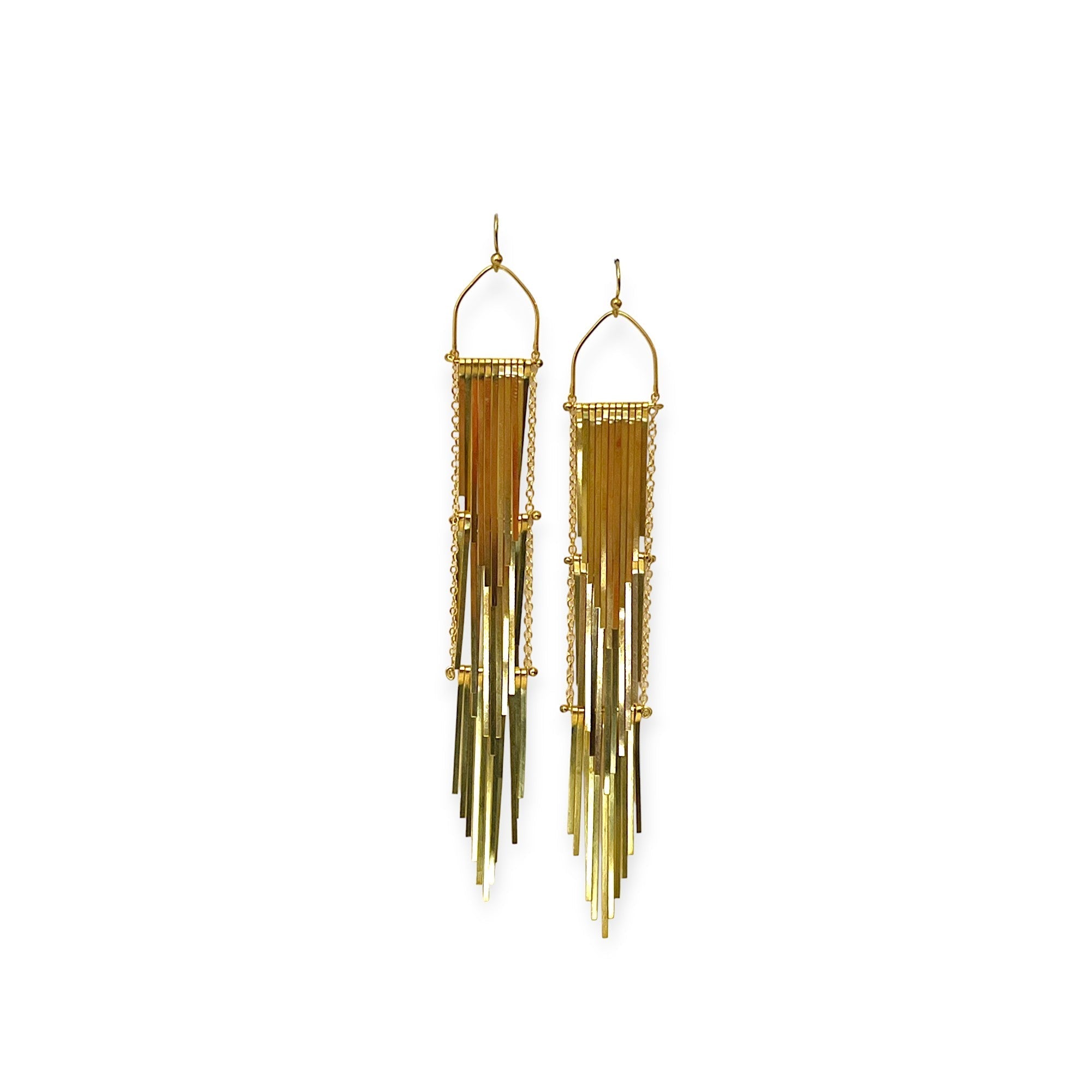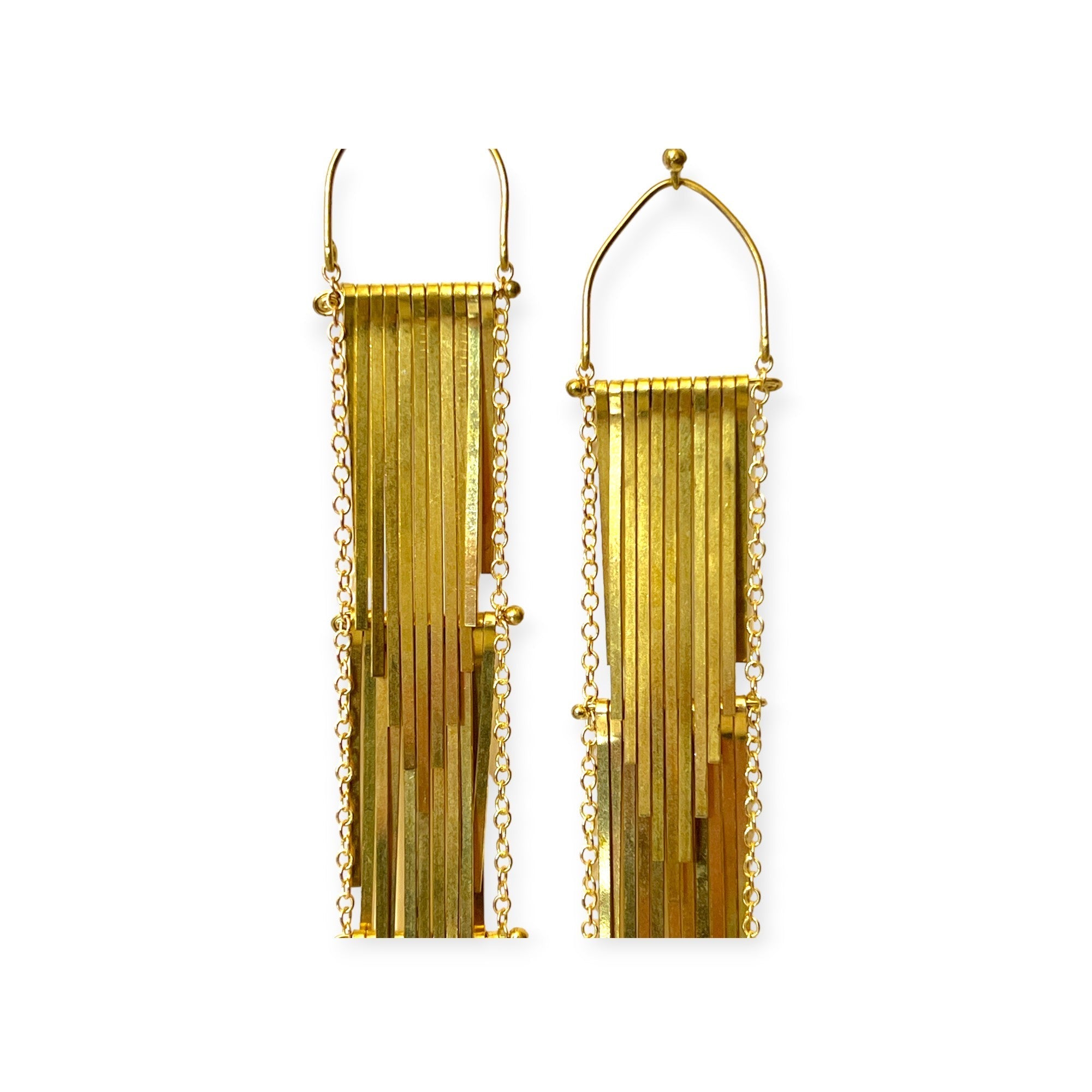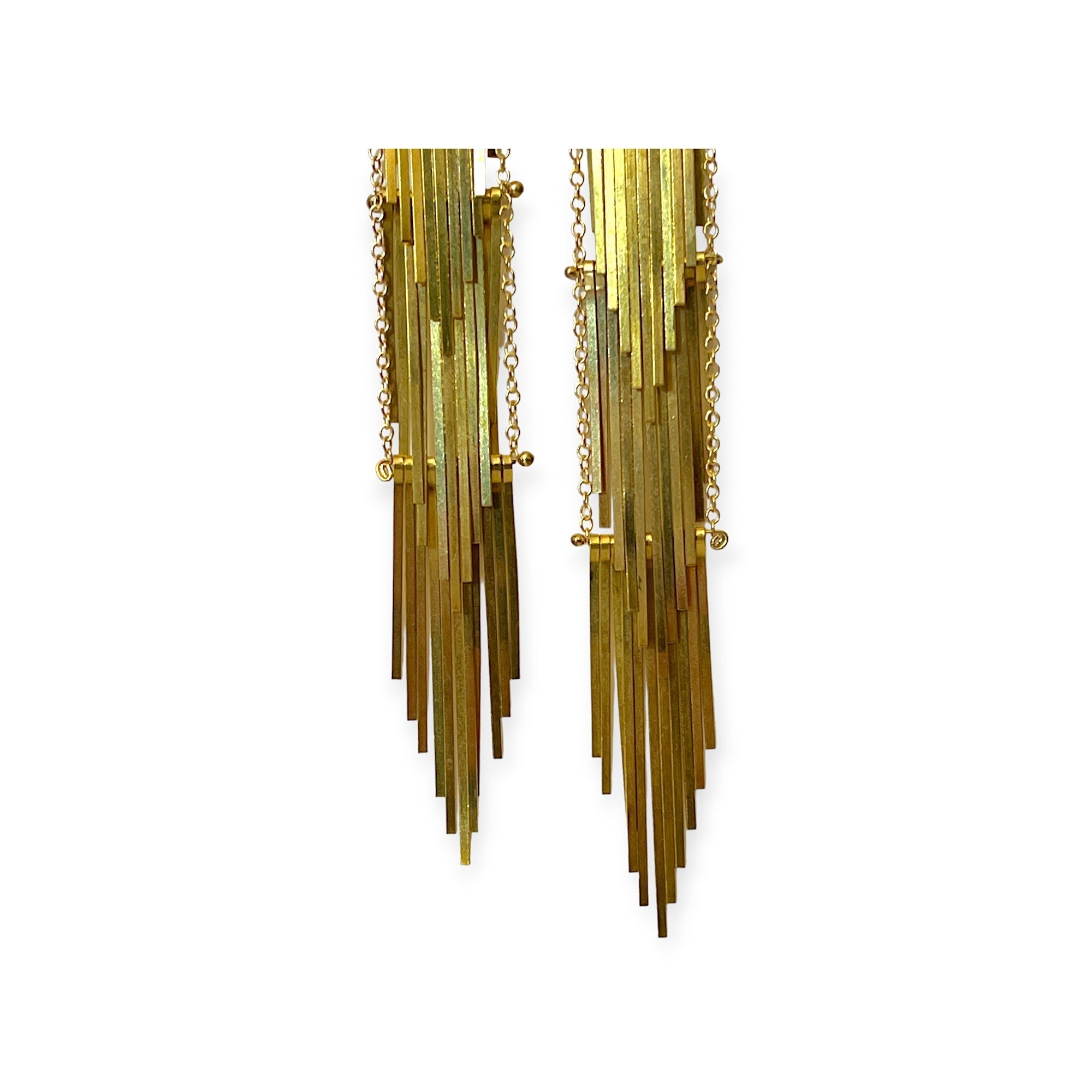 Design: Dramatic brass drop earrings with three fluid, tiered strands for cascading movement