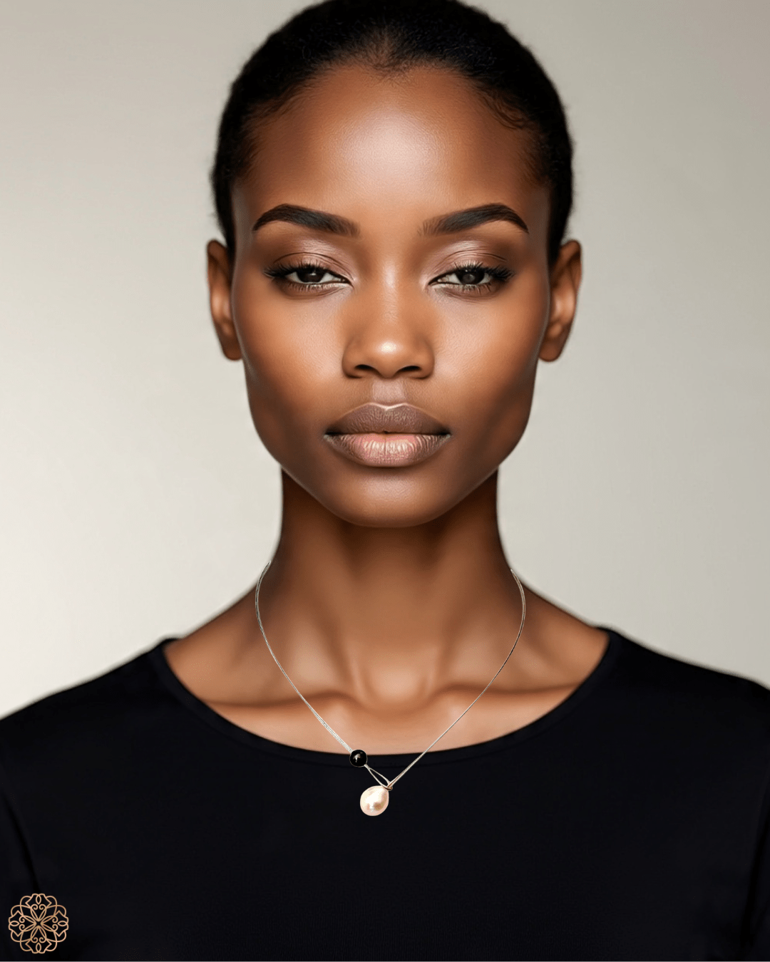 This piece is a study in balanced contrasts: bright meets dark, soft meets strong, classic meets contemporary. The design is deliberately minimal to showcase the natural beauty of the pearls while ensuring versatility—perfect for dressing up a simple tee, adding interest to a crisp blouse, or accenting an elegant evening look.