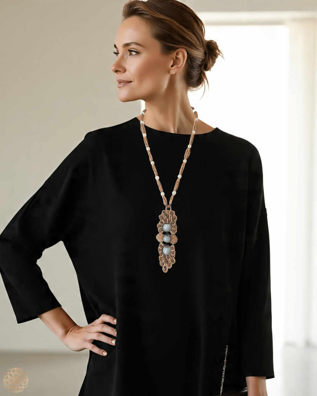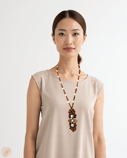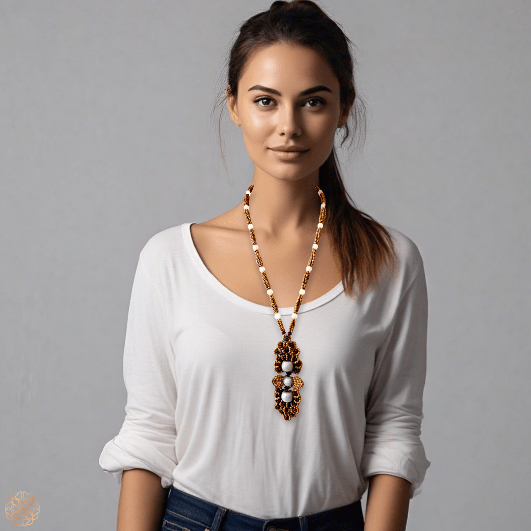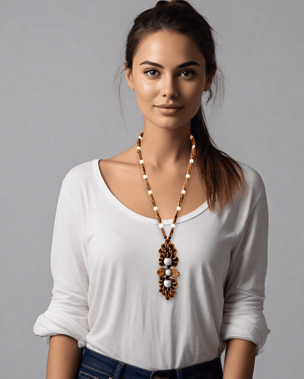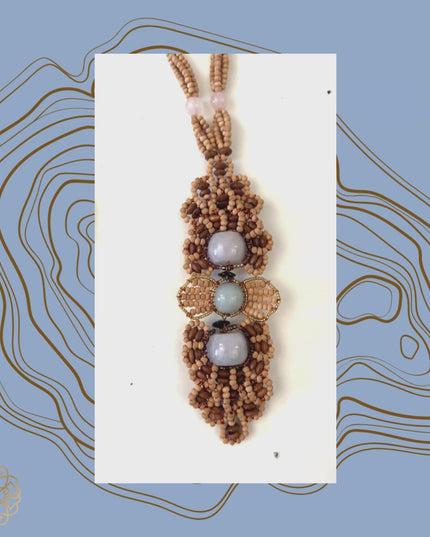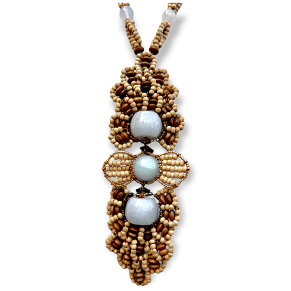 • Handmade wood and gemstone beaded medallion necklace
