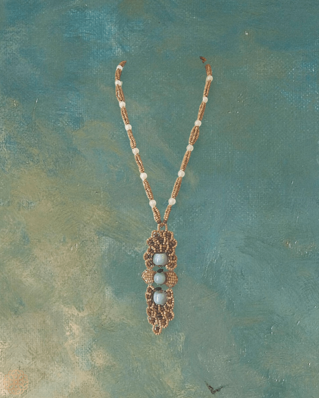 Centered around richly colored magnesite and quartz gemstones, the design draws subtle inspiration from classic Art Deco forms but reinvents them with a character all its own. Crystal, seed, and wood beads add layers of texture, color, and warmth, creating a pendant that feels at once earthy, elegant, and strikingly personal.